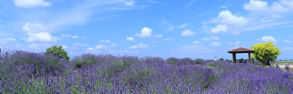 初夏の青空の下、ラベンダーとあやめが咲き誇り一面ブルーの世界が広がります。紫色系の穂状の花が咲き香りに優れているヒドコート。花穂、花茎ともに長く、色が美しく庭のアクセントにも適しているグロッソ。2つの品種が楽しめます。広大なラベンダー堤を散策するといろいろな表情のラベンダーとの出会いがあります。雨上がりであれば雫とラベンダーのきらめき、晴天であれば青空とサファイヤブルーのコントラストは各段の景色です。