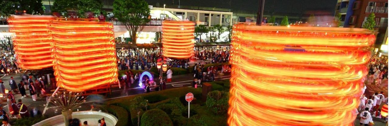 久喜市には、旧久喜町の鎮守である八雲神社の祭礼として行われている久喜の「天王様」と、上清久地内にある八坂神社の例大祭として行われている上清久の「天王様」があります。久喜の「天王様」は七町内から七台の山車が繰り出されます。昼間は神話などから題材をとった人物の人形を山車の上に飾り立て町内を曳き廻します。夜は人形を取りはずし、山車の四面に約500個の提灯を飾りつけた『提燈山車』に早変わりします。夏の夜を彩る久喜市最大のイベント。賑やかな笛や鉦、太鼓のお囃子にのせ、関東一と言われる山車を回転させたりして、市内を巡行する様はまさに圧巻です。